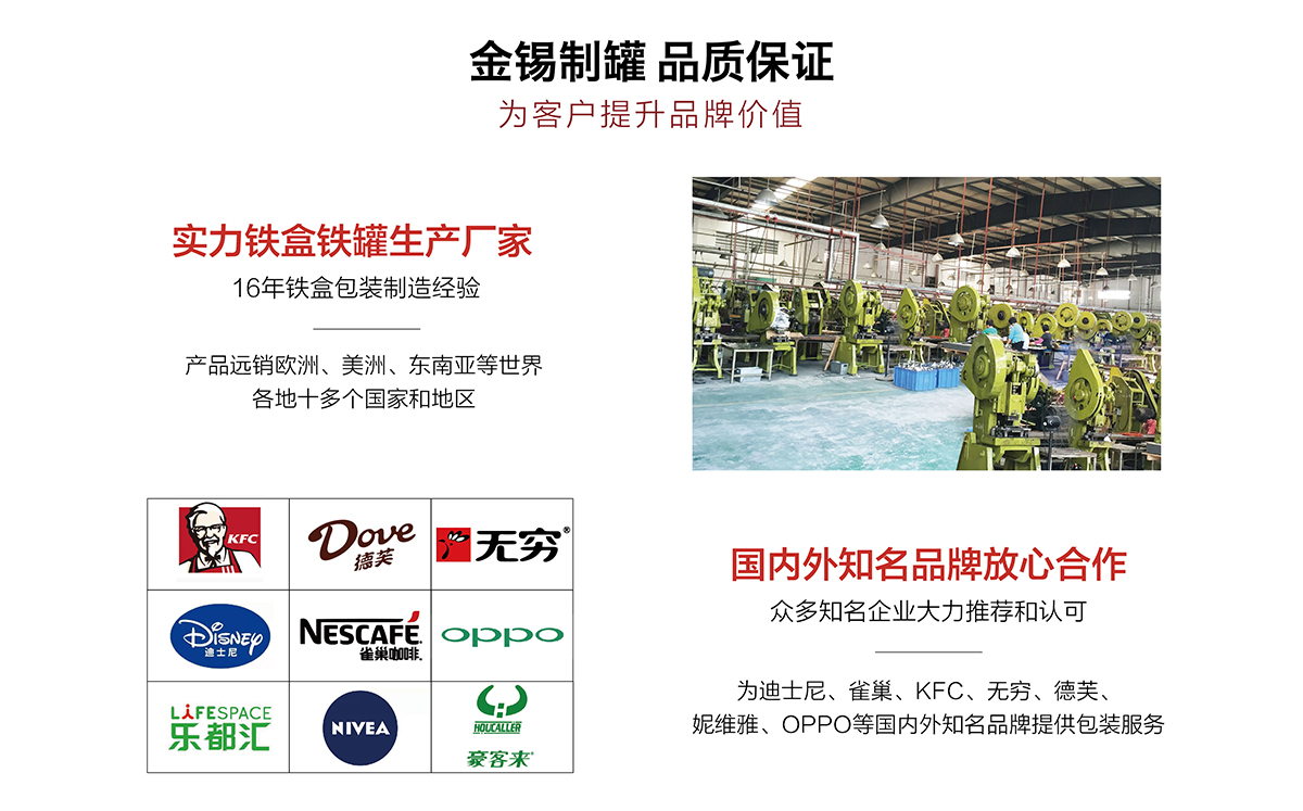 廣州市金錫五金制品有限公司成立于2016年,是已有13年生產(chǎn)經(jīng)驗的實力廠家。我廠是專業(yè)定制優(yōu)良馬口鐵盒、鐵罐、禮品盒、茶葉罐、月餅盒等金屬鐵盒包裝的制罐企業(yè),我們擁有超過6000平方米的標(biāo)準(zhǔn)現(xiàn)代化廠房及八條生產(chǎn)線。公司集產(chǎn)品研發(fā)、設(shè)計、生產(chǎn)、銷售于一體,技術(shù)優(yōu)良,實力雄厚。通過十多年的制罐經(jīng)驗,我們擁有專業(yè)的技術(shù)團隊,嚴格的作業(yè)流程、完整的品質(zhì)保障體系、完善的銷售以及售后服務(wù)系統(tǒng)。